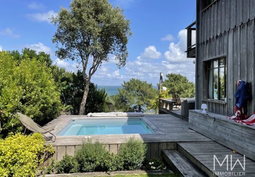 À l’extérieur, vous serez séduit par une grande terrasse en bois suspendue au-dessus du bassin, offrant une vue saisissante sur l’eau et la nature environnante. Un jacuzzi complète cet espace détente, pour des instants de relaxation absolue en plein air.